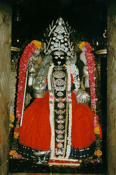 Many are the stories that account for the existence of this Goddess Mariamman and the temple. It is however said that the great Sage Sadashiva Brahmendra played a major role. The Devi herself had asked Sadashiva Brahmendra to install her in the place. With his yogic powers, it is believed that Sadashiva Brahmendra created the image of Punnainallur Mariamman from a snake pit. He also enshrined a powerful yantram after which the Devi herself came into the idol and sat there to bless her devotees. After a few days/months, the story goes that a King by name Venkoji Maharaja Chatrapathi once went on a pilgrimage to the southern parts of the country. On his return journey from Rameswaram, the King had the opportunity to stay, with his retinue, at Samayapuram Mariamman Kovil near Tiruchirapalli. The King had a dream that night, when a young girl, styling herself as Mariamman, asked the King to construct a ‘‘pucca’’ temple for Her as she was in the vicinity of а forest full of **Punnai" Trees and disappeared. Next morning the King returned to his capital and made speedy arrangements for the installation of this Goddess. The deity of this temple later came to be known as Punnainallur Mariamman. The story goes that