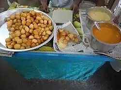 Punugulu is a snack and common street food in Delta Districts of Andhra Pradesh, India.[1][2] Punugulu is a deep-fried snack made with rice, urad dal and other spices.[3] They are often served with peanut chutney, known as palli chutney, coconut chutney, tomato chutney, verusanaga chutney or toordal chutney known as kandhi pachadi, or they can be served with capsicum peanut chutney. They are also very popular all over Delta Andhra and in Hyderabad. It is some times incorrectly called as Punukulu.