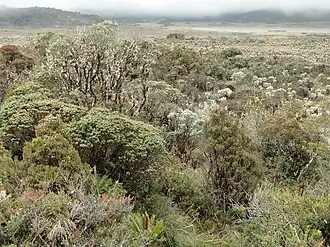 The highest daytime temperatures are between 14 and 16 °C (57 and 61 °F), and the coldest nighttime temperatures below freezing.[4] The average yearly rainfall is 2,500 millimetres (98 in) and tend to decrease as elevation increases. Frost occurs frequently above 3,000 m (9,800 ft) and almost daily above 4,200 m (13,800 ft).[6]