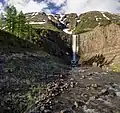 Comprising a vast area of 1,887,251 ha, the park is located in the centre of the Putorana Plateau in the northern part of Central Siberia. The part of the plateau listed on the World Heritage Site contains complete subarctic and arctic ecosystems in an isolated mountain range. The combination of remoteness, naturalness and strict protection ensures that ecological and biological processes continue with minimal human interference. It is a complex of high flat-topped mountain massifs divided by deep and wide canyons. It was created 250 million years ago by a process known as plume volcanism, in which a huge body of magma rose to the surface from 1,800 miles (2,897 kilometers) inside the Earth.[1] Next, the glaciers expanded the canyons and formed the present-day river gorges and deep narrow lakes (Lama, Keta, Glubokoye, Khantayskoye, Ayan, etc.) creating the unique appearance of the plateau. These exotic fjord-like lakes reaching 100–150 km in length and up to 400 metres (1,300 ft) deep are considered to be largest in Siberia after Baikal and Teletskoye. Another feature of the plateau are numerous waterfalls, including the 108 m high waterfall in Kanda river gorge considered to be Russia's highest. The area is also one of the richest in terms of plant diversity in the Arctic.[2]