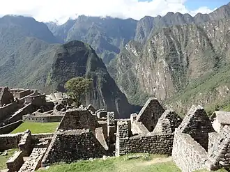 Putucusi (center-left) behind the ruins of Machu Picchu | |