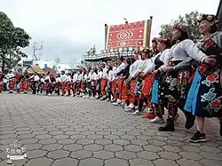 Women wear the same long-sleeved cropped bodice as men, except the color is bright blue or white. The bodice is paired with a bagelup, a small apron usually black (sometimes white) with a front embroidered pocket. In old age, the bagelup is replaced by the sugun, an apron tied at the waist with a pink belt. The lower attire then features a black underskirt with subtle embroidery, topped by an open skirt crossing on the left side, revealing inner skirt embroidery. Additionally, the lower part of the legs are covered with two rectangles of embroidered black cloth secured by four straps around the calves.[8] Women wear a variety of accessories, including silver bells, Japanese coins, bead headbands, silver hairpins, chest ornaments, silver and bead bracelets.[9] The crown of flowers mentioned in the context of men, remains an integral part of women's attire, as well.
