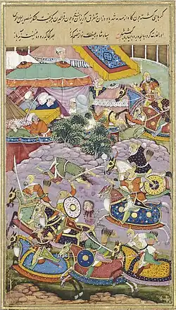 ![]() Timur's forces led by his son Umar Shaykh defeating the army of Qamar al-Din; a folio from the royal Mughal Zafarnama, by Jagjivan Kalan, Mughal India, c. 1595-1600 | |