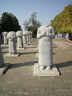 Leading into the mausoleum is a spirit way, which is flanked on both sides with stone statues like the later tombs of the Song dynasty and Ming dynasty tombs. The Qianling statues include horses, winged horses, horses with grooms, lions, ostriches, officials, and foreign envoys.[18] The khan of the Western Turks presented an ostrich to the Tang court in 620 and the Tushara Kingdom sent another in 650; in carved reliefs of Qianling dated c. 683, traditional Chinese phoenixes are modelled on the body of ostriches.[19] Historian Tonia Eckfeld states that the artistic emphasis on the exotic foreign tribute of the ostrich at the mausoleum was "a sign of the greatness of China and the Chinese emperor, not of the foreigners who sent them, or of the places from which they came".[19] Eckfeld also asserts that the 61 statues of foreign diplomats sculpted in the 680s represents the "far-reaching power and international standing" of the Tang dynasty.[20] These statues, now headless, represent the foreign diplomats who were present at Emperor Gaozong's funeral.[1] Historian Angela Howard notes that along the spirit ways of the auxiliary tombs—such as Li Xianhui's—the statues are smaller, of lesser quality, and fewer in number than the main spirit way of Qianling leading to Emperor Gaozong and Wu's burial.[21] Besides the statues, there are also flanking sets of octagonal stone pillars meant to ward off evil spirits.[6] A 6.3-metre-tall (21 ft) tiered stele dedicated to Emperor Gaozong is also located along the path, with a written inscription commemorating his achievements; this is flanked by Wu Zetian's stele which has no written inscriptions.[6] An additional stele by the main tumulus was erected by the Qianlong Emperor (r. 1735–96) during the mid-Qing dynasty.[1]