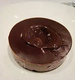 Quay serves contemporary Australian cuisine.[2] The restaurant has several signature dishes, including the "Snow Egg", an egg-shaped poached meringue with an ice cream centre, which is coated in a sweet tuile by using a blow torch. It is served on a bed of fruit fool and granita.[5] The "Snow Egg" was re-created in the finale of the 2010 series of MasterChef Australia[6][7] and after achieving cult status was phased out in 2018.[8] Another signature dish is Gilmore's "Eight-Textured Chocolate Cake", which in an earlier version included only five different textures, but was subsequently developed and now contains eight.[2]