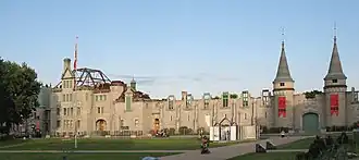The Voltigeurs de Québec Armoury was severely damaged by a fire on April 4, 2008. All but a rear wall and turrets beside the front door were burned.[5] Les Voltigeurs de Québec Museum in the amoury which housed various artifacts from the regiment was also lost in the fire. However, officials estimate that 90 percent of the artifacts were saved due to the efforts of members of the regiment and local firefighters.[6] The armoury was to have been one of the venues for the celebration of Quebec's 400th birthday.[7] The armoury's wooden roof was one of the largest of its kind in Canada.[8]