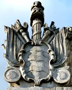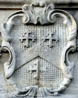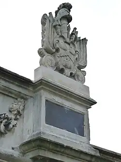 Granville: Gules, three clarions or. For George Granville, 1st Baron Lansdowne of Bideford (1666-1735), nephew of John Granville, 1st Earl of Bath (1628–1701) and heir male of William Henry Granville, 3rd Earl of Bath (1692-1711).[45] It is the only escutcheon with heraldic supporters, generally reserved for use by nobility, here Two winged griffins rampant or. Above the escutcheon is a baron's coronet. He is identifiable by the style of his coronet and by his motto, shown inscribed on a scroll below: Deo, Patriae, Amicis[46] ("For God, my Country and Friends"), the motto of his uncle John Granville, 1st Earl of Bath having been: Futurum invisibile ("The future is unseen").[47] The arms are not those of John Granville, 1st Earl of Bath (1628–1701), or of his son Charles Granville, 2nd Earl of Bath (1661–1701). The latter's son William Granville, 3rd Earl of Bath (1692-1711) died aged only 19 two years before the building was completed in 1713. | ||||