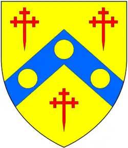 Crossing:(?) A chevron between three cross crosslets (unknown). Apparently Crossing of Exeter, given similarly by Vivian as Or, on a chevron azure between three crosses crosslet fitchée gules as many bezants[39] which family was heir to the Dodderidge family of Barnstaple and of Bremridge, South Molton. Hugh Crossing was Mayor of Exeter in the 17th century[39] and his eldest son Francis Crossing (c.1598-1638) was Member of Parliament for Mitchell in 1626 and for Camelford in 1628.[40] | ||||