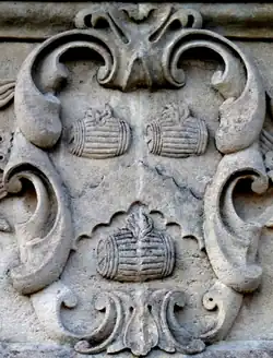 Above is a sculpted escutcheon with his armorials: Argent, a chevron engrailed between three tuns sable fire issuing from the bung hole proper. (The ancient building known as the "Three Tuns Inn" on the west side of Barnstaple High Street[10] is in 2015 now the Pizza Express restaurant[11][12]). Above is a plumed helm placed on a fasces, part of an antique trophy of arms. He was the younger brother of Henry Incledon (1671-1736) of Buckland House, Braunton, whose arms are shown on the front (south) parapet, a son-in-law of the merchant John Davie (d.1710), whose arms are also shown on the front parapet. Robert's first wife was Mary Lethbridge (d.1709), daughter of Christopher Lethbridge (d.1713) of Westaway House, Pilton, (whose "big and sumptuous" mural monument survives in Pilton Church,[13]) whose arms are also shown on the front (south) parapet.