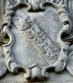 The inscription was transcribed by the Devon topographer Rev. John Swete (d. 1821) in his "Journals".[16] On the sides of the base of the statue are identical heraldic escutcheons showing the arms of Robert Rolle impaling the arms of Duke, Per fesse argent and azure, three chaplets counterchanged, for his wife Elizabeth Duke (d. 1716), daughter of Richard Duke (1652–1733),[17] MP, of Otterton, Devon.