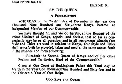 15. ^ A proclamation affecting the change in royal style and titles is dated 10 Mar 1964 and took effect upon publication as Legal Notice No. 120 in Supplement No. 56 to Kenya Gazette, No. 18, 21 Apr 1964.