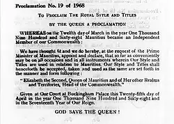 - 25 April 1968 – 12 March 1992: Elizabeth the Second, Queen of Mauritius and of Her other Realms and Territories, Head of the Commonwealth[9][10][11]