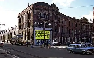 Queens Hall was a concert and exhibition venue located in Leeds, West Yorkshire, England. It was originally a tram and then a bus depot and had latterly become a venue hosting events such as the Ideal Home Exhibition and the 1981, 1982, 1988 and 1989 Great British Beer Festival,[1] flea markets, travelling fairs and concerts.