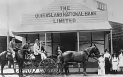 The Queensland National Bank was the first and most successful of Queensland's three indigenous 19th century banks. It was established in March 1872 by a group of prominent Queensland squatters, politicians, lawyers, and businessmen who wished to secure development capital free from overseas or intercolonial control. Its first office was established in Queen Street, Brisbane in that year and the bank attracted widespread Queensland patronage. In 1879 it secured the whole of the Queensland Government's banking business. By 1880 it held 40% of deposits in the colony and dominated the Queensland economy. This was not, however, the first bank established in Childers, the Bank of North Queensland and the Commercial Banking Company of Sydney both being present in the 1890s and erecting premises in the newly emerging sugar town in 1900.[1]