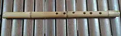 The quena (hispanicized spelling of Quechua qina,[1] sometimes also written kena in English) is the traditional flute of the Andes. Traditionally made of cane or wood, it has 6 finger holes and one thumb hole, and is open on both ends or the bottom is half-closed (choked). To produce sound, the player closes the top end of the pipe with the flesh between the chin and lower lip, and blows a stream of air downward, along the axis of the pipe, over an elliptical notch cut into the end. It is normally in the key of G, with G4 being the lowest note. It produces a very "textured" and "dark" timbre because of the length-to-bore ratio of about 16 to 20 (subsequently causing difficulty in the upper register), which is very unlike the tone of the Western concert flute with a length-to-bore ratio of about 38 to 20.