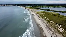 Goosewing Beach is a 1.4 kilometres (0.87 mi) long cobbly barrier beach[2] at the southern end of Quicksand Pond.[9] Its dunes are dominated by beachgrass and seaside goldenrod.[8]