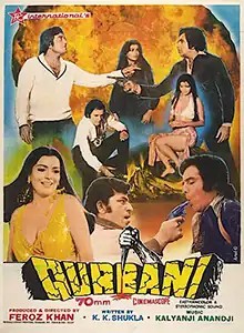 Qurbani (transl. Sacrifice) is a 1980 Indian Hindi-language musical romantic action thriller film produced, directed, co-written by and starring Feroz Khan (under the banner FK International). The film co-stars Vinod Khanna, Zeenat Aman, Amjad Khan, Shakti Kapoor, Aruna Irani, Amrish Puri and Kader Khan.[1]