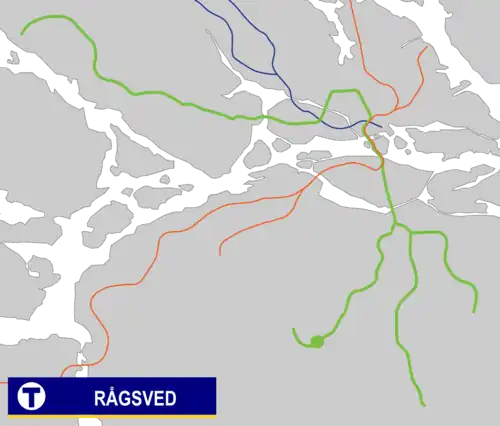 Rågsved metro station is on the Green line of the Stockholm metro, located in Rågsved, Söderort. The station was inaugurated on 13 November 1959 as the southern terminus of a one-station extension from Högdalen. On 1 December 1960 the line was extended further to Hagsätra.[2] The distance to Slussen is 8.5 km (5.3 mi).