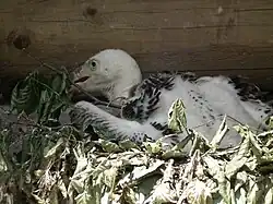 This species of vulture is considered to be monogamous, forming lifelong breeding pairs. After courtship the pair will work together to build a nest using sticks, grass, and leaves that they have gathered or stolen from other nests.[12] Rüppell's vultures build these nests on cliffs, and in key breeding areas they are known to nest in large colonies containing hundreds of breeding pairs.[20] Both parents share in incubation of their egg over a period of 55 days. Once the chick hatches, both parents will feed and tend to it for about 150 days when it fledges.[12][21] Young remain dependent on their parents after fledging, not reaching independence until the next breeding season. During this time they learn how to find and compete for food. Due to their large feeding range, they can only rear a single chick at a time. This results from the energy requirements needed for flight and foraging added on to the task of feeding their young.[20][17]
