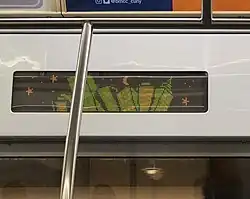 Unlike the rest of the NTT fleet at the time, the R143s are equipped with interior LED screens, which take the place of the MTA Arts for Transit cards that are usually located there. These screens can display advertisements, public safety announcements, and other information.[10] Several cars of the NTT fleet were similarly retrofitted with LCD screens after they were delivered, and all subsequent orders are built with these screens. However, the LCD screens have the capability to display multiple colors instead of only red, orange, and green.