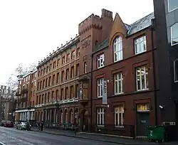 The building was designed by Samuel Knight as the headquarters of the St Giles's and St George's Bloomsbury Rifles and completed in 1882.[3] It has a notable artistic history: in the 1900s, Sergei Diaghilev and the Ballets Russes rehearsed there.[3] The Bloomsbury Rifles amalgamated with the 1st Middlesex (Victoria and St George’s) Volunteer Rifle Corps and moved out to the Davies Street drill hall in 1908.[4] In their place the 12th (County of London) Battalion, London Regiment (The Rangers) took over the Drill Hall in Chenies Street on 25 June 1908.[4] The battalion was mobilised at the Drill Hall in August 1914 before being deployed to the Western Front.[5]