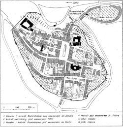 Until the end of the 5th century AD, the lands of the later Racibórz settlement were inhabited by East Germanic Silinger tribes. The town is one of the oldest in Upper Silesia, the site of a hill fort where the old trade route from the Moravian Gate down to Kraków crossed the Oder river. There is a possibility that Racibórz was mentioned in a work of the "Bavarian Geographer" in 845 (this document mentions five strongholds of the Slavic Golensizi (Golenshitse, Holasici in Czech), a proto-Polish tribe, probably Racibórz was one of them).[2] The name Racibórz is of Slavic origin and probably is derived from the name of one Duke Racibor, the city's founder.