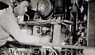 The sinking of RMS Titanic in 1912 due to a collision with an iceberg spurred the Canadian inventor Reginald Fessenden (1866–1932) to begin work on a long-distance underwater sound transmission and reception system that could detect hazards in the path of a ship. This led to the invention of the Fessenden oscillator, an electro-acoustic transducer which by 1914 had a proven ability to transmit and receive sound at a distance of 31 nautical miles (57 km; 36 mi) across Massachusetts Bay and to detect an iceberg ahead of a ship at a range of 2 nautical miles (3.7 km; 2.3 mi) by bouncing sound off it and detecting the echo, as well as an occasional ability to detect the reflection of sound off the ocean bottom. Further impetus to developing practical applications of underwater acoustics came from World War I, which prompted the Royal Navy, United States Navy, and United States Army Coast Artillery Corps to experiment with sound as a means of detecting submerged submarines. In postwar experiments, the Coast Artillery Corps's Subaqueous Sound Ranging Section conducted experiments in shallow water in Vineyard Sound off Massachusetts in which it detonated explosive charges underwater at the ends of established baselines and measured the amount of time it took for the sound to arrive at hydrophones at the other ends of the baselines in order to establish very accurate measurements of the speed of sound through water.[1] And in 1923, the Submarine Signal Company improved upon its underwater signaling devices by equipping them with radio transmitters that sent signals both to identify the particular device and to indicate to approaching ships that it would generate an acoustic signal at a specific time interval after it sent the radio signal, allowing ships to identify the specific navigational aid they were approaching and to take advantage of a one-way ranging capability that let their crews determine their direction and distance from the navigational aid.[3]