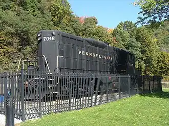 No. 1361 was replaced at the Curve by Pennsylvania Railroad 7048, a preserved GP9 Diesel-electric locomotive.[49] The locomotive was built by Electro-Motive Division of General Motors in December 1955 for the Pennsylvania Railroad, and later passed to Conrail.[50] In 1985, Conrail repainted No. 7048 in its original Pennsylvania Railroad livery and donated it to the museum. A cosmetic restoration of 7048 was underway in late summer 2021.