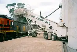 Despite the huge improvement brought about by bulk handling, conventional outloading equipment at the country silos on Eyre Peninsula only filled rail wagons at up to about 200 tonnes per hour. In 2003, a mobile fast loader was developed to fill rail wagons at 1000 tonnes per hour, allowing a full-length train to be loaded at one location in a couple of hours.[2]: 119