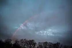 A sleetbow forms in the same way as a typical rainbow, with the exception that it occurs when light passes through falling sleet (ice pellets) instead of liquid water. As light passes through the sleet, the light is refracted causing the rare phenomena. These have been documented across United States with the earliest publicly documented and photographed sleetbow being seen in Richmond, Virginia on 21 December 2012.[65] Just like regular rainbows, these can also come in various forms, with a monochrome sleetbow being documented on 7 January 2016 in Valparaiso, Indiana.