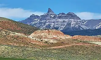 The peak is situated approximately 16 miles east of the Continental Divide in the Absaroka Range. It is set in the Washakie Wilderness, on land managed by Shoshone National Forest. Topographic relief is significant as both the east and west aspects rise 2,000 feet (610 meters) in one-half mile. The nearest town is Dubois, Wyoming, 16 miles to the south-southeast, and the peak is a conspicuous landmark seen from U.S. Route 26 / U.S. 287. The mountain's name has been officially adopted by the United States Board on Geographic Names, and was in use in 1914 when published in an USGS bulletin.[3][4] The first ascent of the summit was made July 13, 1960, by H. & Mrs. Kellogg.[5]