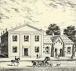 Randolph County was organized in 1795 when Illinois was still part of the Northwest Territory, although an earlier courthouse, built for an early regional territorial court, predated the county by sixteen years.[1]: 100 In the earliest years, three justices of the peace, acting collegiately, served the purposes of a county court; the first regular county court met in 1810 at the tavern of one Thomas Cox.[1]: 103 No courthouse was built during the territorial period; Cox and other Kaskaskia tavern-keepers hosted the county government until 1812, in which year the county purchased a house in Kaskaskia.[1]: 111 The first purpose-built courthouse was completed in 1821 after eighteen months of construction, and the former house sold to become a tavern; a two-story brick structure, the new courthouse cost $4,750.[1]: 114