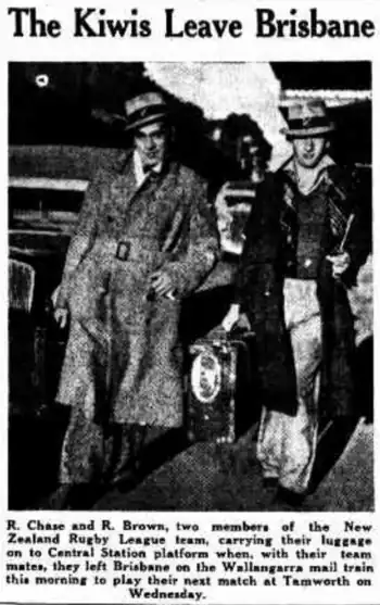 Against Toowoomba Chase was again in the centres though this time he was paired with Jack Smith for the 22 June match. New Zealand won by the narrow margin of 12–11 and did not impress before a crowd of 2,500 at the Athletic Ground.[110] New Zealand then played Queensland once again at the Brisbane Cricket Ground and were defeated 21–12 after leading 12–5 at halftime. Chase partnered Jack Hemi in the centres this time. Hemi had been in magnificent form in the tour but had been played at fullback.[111] After the match Chase was pictured with Ray Brown at Central Station in Brisbane where they were about to depart on the Wallangarra mail train to play Tamworth.[112] Chase was rested from the match with his next appearance against Newcastle on 2 July at the Newcastle Sports Ground before 5,000 spectators. New Zealand played well in a 30–19 win. Their final try had the crowd cheering for “several minutes” with Wilfred Brimble picking the ball up in his own twenty five and passing it “to Tittleton, who passed to Chase. W. Brimble took it again and the ball then went to W. P. Brimble and on to John Anderson, Tittleton and Jack McLeod, for the last-named to score and Hemi to add the goal. It was league football at its best”.[113] The final match of the tour was against Sydney at the Sydney Cricket Ground on 6 July. New Zealand trailed 11–5 at halftime before coming back to draw the match 19–19 before a crowd of 5,000. Though they could have won if not for a late Sydney try. In the first half “there was a fine handling burst in which Brimble, Hemi, Kay and Chase took part to carry the game into the home 25. From there New Zealand rushed the ball over the line and McLeod scored a few feet from touch in goal” to give New Zealand a 3–0 lead. The match see-sawed from there with New Zealand attacking when the game ended. Chase had been partnered with yet another centre in the match, playing alongside Arthur Kay[114]