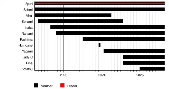 At Stardom New Blood 7 on January 20, 2023, Ami Sourei and Nanami defeated Momo Kohgo and Momoka Hanazono, and Tomoka Inaba and Mirai defeated Saya Iida and Hanan in the quarterfinals of the inaugural New Blood Tag Team Championship tournament.[28] At Stardom Supreme Fight 2023 on February 4, 2023, Syuri, Konami and Ami Sourei defeated Utami Hayashishita, AZM and Lady C, and Mirai unsuccessfully fought Chihiro Hashimoto.[29] At Sunshine 2023 on June 25, Oedo Tai was defeated by Queen's Quest in a six-on-six steel cage match in which the losing unit was forced to lose a member. Saki Kashima was the last member eliminated from Oedo Tai and was attacked by the other members of Oedo Tai and forced to withdraw from the unit.[30] At Mid Summer Champions 2023 on July 2, Kashima successfully defended the High Speed Championship against Fukigen Death. After the match, Oedo Tai attacked Kashima again, but Syuri and Sourei rescued her and offered a spot in God's Eye, which Kashima accepted.[31] On December 3, Scandinavian Hurricane joined the stable.[32] At New Years Stars 2024 on January 3, 2024, Abarenbo GE participated in the 2024 Triangle Derby, in which they defeated Baribari Bombers in the finals to win the tournament and the Artist of Stardom Championship.[33]