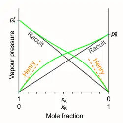 Notably, when the concentration of A is small, its vapor pressure instead follows Henry's law, and likewise for substance B when its concentration is small.