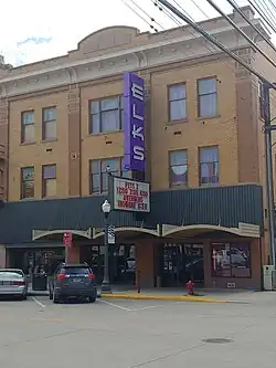 The Elks Building, located at 512 6th Street, was designed by J.P. Eisentraut in 1911 for use as a meetinghouse by the Benevolent and Protective Order of Elks.[8] The opening ceremony was held on August 30, 1911.[9] The Elks also built a theater inside, which opened on June 6, 1912, with a showing of "The Flirting Princess";[10] this also led to the building itself being referred to as the Elks Theatre, by which name it is still known today. Later, it hosted various businesses, including the United National Bank and the Bible and Book Store on its ground floor. The Elks sold it to a private developer in 1972, who continued to use it as a social club.[11] Today, it still operates as a theater.[8]