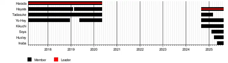 On the seventh night of The First Navigation 2017 from January 21, Hayata and Yo-Hey defeated Hi69 and Taiji Ishimori in tag team competition. After the bout concluded, they demanded a match for the GHC Junior Heavyweight Tag Team Championship which was vacant at the time.[1] At The Second Navigation 2017 on February 14, Atsushi Kotoge defeated "Momo No Seishun Tag" partner Daisuke Harada, match which ended their affiliation as a tag team.[2] Four nights later on February 18, Hayata and Yo-Hey unsuccessfully wrestled XX (Hi69 and Taiji Ishimori) for the vacant junior tag team titles, only for Harada and Tadasuke to step up as the next challengers after the bout concluded.[3] On February 21, 2017, Hayata and Harada defeated Kaito Kiyomiya and Takashi Sugiura in tag team competition. At the end of the event, they declared the formation of the stable alongside Yo-Hey and Tadasuke.[4]
