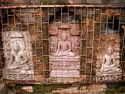 Around the entrance were a number of large relief panels of standing figures, several now removed elsewhere. On the outside wall the only one left in place is the female figure (illustrated) holding a flowering branch and making the varadamudra with her proper right hand. She is perhaps a river goddess, or Marici.[18] In a niche inside the porch is an image of the river goddess Yamuna in "sisterly camaraderie" with two smaller companions (illustrated below). There was probably a matching Ganga panel on the other side, but this is now missing; the pair are very common figures at the threshold of Buddhist and Hindu establishments.[19] Other common figures in monasteries are pairs of Pancika (the Hindu Kubera) and his consort Hariti, representing material and spiritual wealth at more than one level.[20] The style of these figures demonstrates that they were made at the same period as the sculpture on the Baitala Deula Hindu temple in Bhubaneswar, and it has been suggested that some individual sculptors worked at both sites, "a lack of sectarian specialization" in builders and carvers in India being very common.[21]