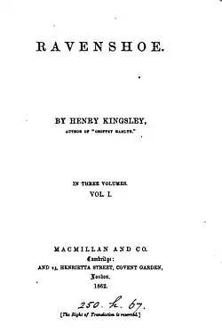 Ravenshoe is a novel by English author Henry Kingsley, published in 1862. It has been noted for the complexity of its three-part plot,[1] and for its description of the Charge of the Light Brigade, a failed military action during the Battle of Balaclava in the Crimean War.[2][3][4]