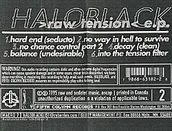 raw tension e.p. (stylized as >Raw Tension<) is an EP by haloblack, released on August 23, 1995, by Fifth Colvmn Records. It contains outtakes and remixes from the band's first two full-length Haloblack albums, Tension Filter and funkyhell. Intended to be pressed on compact disc in 1995 with its six songs contained in one continuous track, the EP was instead issued on cassette with an additional seventh track and te songs separated.[1] On March 7, 2001, the CD-R version was released with original intended track listing intact on digital format.[2]