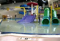 Ray's Splash Planet (often referred to as Ray's) is a Mecklenburg County, North Carolina funded water park located in Charlotte, North Carolina, United States. The aquatic facility is operated by the Mecklenburg County Park and Recreation department. Ray's Splash Planet is considered one of the largest indoor water parks in both of the Carolinas and is the largest water park in Charlotte, North Carolina, with over 29,000 square feet of space and using over 117,000 gallons of water at 87 degrees.[1] The water is cleaned and sanitized through the use of chlorine, filtration and an ultraviolet germicidal irradiation system. There are multiple attractions including the Blue Comet, a three-story figure 8 slide, and other family friendly attractions like the Orbiter, Saturation Station, the Vortex, Meteor Showers, Moon Beach and the Sea of Tranquility.[2] The water park also features a fitness center and gymnasium shared with the Irwin Academic Center, an educational center of the Charlotte-Mecklenburg Schools system. The first floor of the facility includes the pool area, locker rooms, birthday party classrooms and concessions stand. The second story includes the fitness center with an aerobics/dance studio. Access to the indoor gymnasium is also located on the second floor. Ray's Splash Planet is located on North Sycamore Street near Johnson & Wales University and is just off Interstate 77 in North Carolina in the Third Ward section of Uptown Charlotte. The water park opened on October 15, 2002 with help from Mecklenburg County Park and Recreation's partnership with Charlotte-Mecklenburg Schools. Major competitors are Carowinds in Charlotte, North Carolina, Great Wolf Lodge in Concord, North Carolina and Wet 'n Wild Emerald Pointe in Greensboro, North Carolina.