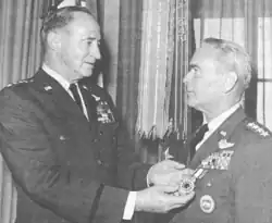 His military decorations include the Distinguished Service Medal, Legion of Merit, Army Commendation Medal with oak leaf cluster and Air Force Outstanding Unit Award Ribbon with oak leaf cluster.