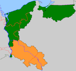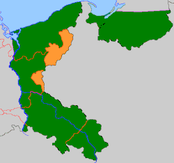 Most of long Germanized Lower Silesia, Farther Pomerania and Eastern Prussia remained undisputed.[32] However, in reaction to Hitler's Germany threats to Poland shortly before the outbreak of World War II, Polish nationalists displayed maps of Poland including those ancient Polish territories as well, claiming their intention to recover them.