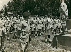 By early May 1945, the 1st Parachute Brigade had been brought up to strength, albeit mainly with inexperienced replacements and the survivors of the 4th Parachute Brigade, which had been disbanded.[74] On 4 May, the brigade was detached from 1st Airborne Division and 1st Parachute Battalion transported to Denmark for occupation duties while the rest of the brigade remained in Britain as a reserve formation.[75] Without the brigade, the 1st Airborne Division deployed to Norway, but on their return were disbanded on 15 November 1945.[76] The remaining airborne division, the 6th, went to serve in Palestine. On 8 April 1946, the brigade, now under command of Brigadier Hugh Bellamy, arrived in Palestine where it deployed in an internal security role. They replaced the 6th Airlanding Brigade, which was reformed as a normal infantry formation.[77] Disbandment of the last brigade was overseen by its final commander Brigadier James Hill.[78] Except for the three battalions of the 2nd Parachute Brigade in England, the remainder of the British airborne forces were disbanded.[79] Between March and May 1948, the 6th Airborne Division was dismantled, with the men leaving for England to be demobbed. The 1st Parachute Battalion, along with divisional headquarters, were the last airborne units to leave Palestine, three days after the British mandate ended on 18 May.[80]