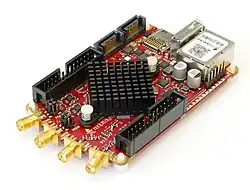 Due to the wide bandwidth of the ADC and DAC, the Red Pitaya can be used as a software-defined radio receiver and transmitter and in other radio frequency applications.[3] HAMLAB, a fully featured SDR HF transceiver with an output power of 10 W based on the Red Pitaya board is released in the amateur radio market in October 2016.[4]