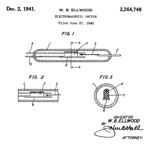 The reed switch[i] is an electromechanical switch operated by an applied magnetic field. It was invented in 1922 by professor Valentin Kovalenkov at the Petrograd Electrotechnical University,[1] and later evolved at Bell Telephone Laboratories in 1936 by Walter B. Ellwood into the reed relay. In its simplest and most common form, it consists of a pair of ferromagnetic flexible metal contacts in a hermetically sealed glass envelope. The contacts are usually normally open, closing when a magnetic field is present, or they may be normally closed and open when a magnetic field is applied. The switch may be actuated by an electromagnetic coil, making a reed relay,[2] or by bringing a permanent magnet near it. When the magnetic field is removed, the contacts in the reed switch return to their original position. The "reed" is the metal part inside the reed switch envelope that is relatively thin and wide to make it flexible, resembling the reed of a musical instrument. The term "reed" may also include the external wire lead as well as the internal part.[i]