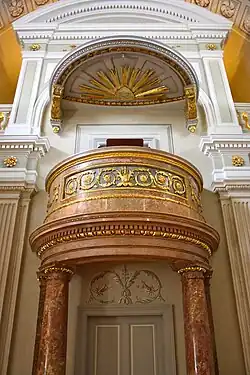 The position of the pulpit in the center of the wall, facing the pews, identifies the Reformed City Church as a preaching church, with the sermon at the center of the service.[24] The semi-circular, early classicist pulpit dates from 1774 and stands on Tuscan columns and pilasters made of reddish marble, adorned with gilded acanthus ornaments. The sounding board features a halo of rays surrounding the Tetragram on its underside.