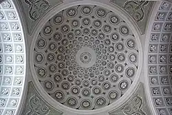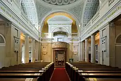 The interior of the church is characterized by a lack of images and crosses, reflecting a strict adherence to the Second Commandment in the Reformed tradition. Grisaille wall paintings mimic stucco with rosettes and acanthus motifs.[19] The pictorial design of the domes à l'antica, resembling the Paris Pantheón, shows the influence of French classicism on architect Gottlieb Nigelli, who studied in Paris.[39]