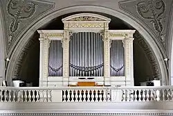 The first organ in the Reformed City Church was built in 1695, presumably sourced from an abandoned monastery, and was likely adapted by the Viennese organ builder Franz Xaver Christoph. It was replaced in 1901 by a new organ donated to Cilli by the Dresden organ builder Johannes Jahn.[42] The Jahn organ, which was last renovated in 1929, could not be fundamentally repaired after the Second World War due to a lack of funds, ultimately falling into a desolate condition. Additionally, its console was unfavorably located on a narrow side due to spatial constraints. The next organ was built by the Viennese organ builder Herbert Gollini in 1974. Gollini retained the neoclassical case of the Jahn organ and continued to use its pipes. The Gollini organ is a mechanical slider chest organ with 25 stops, distributed over two manuals and pedals.[43]