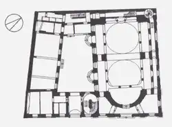 In front of the main room on the long side facing Stallburggasse is a corridor, at the end of which a spiral staircase leads to the galleries. A vestibule separates the inner and outer main doors facing Dorotheergasse. There are side entrances to the main room on both sides of the inner main portal.[19] Following the 1887 renovation, these side entrances were intended to allow separate access to the church for men and women, reserving the inner main portal for high feast days, blessings, and funerals.[15] Two further side gates, formerly the main portals, connect the church directly to the inner courtyard.